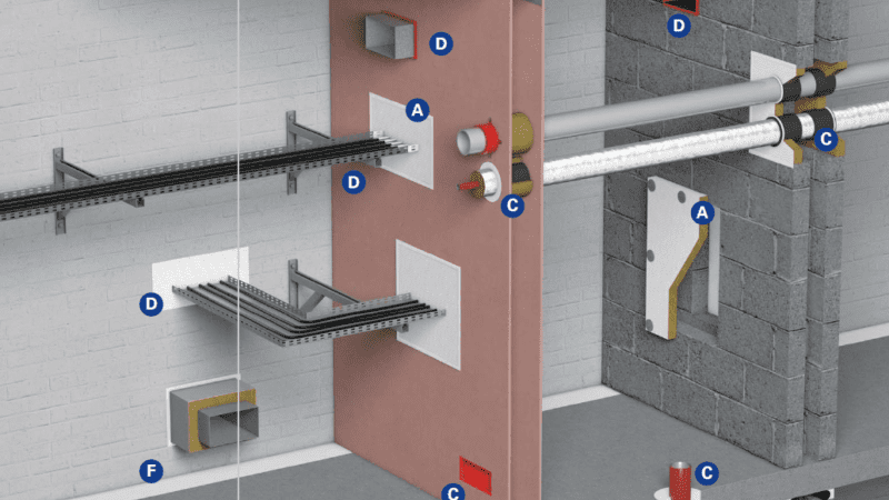 One of the most renowned challenges in construction concerns fire-safing interfaces between rooms or floors, with openings for technical services installations to pass through. Depending on the context, engineers can use specific fire-blocking solutions such as 2-hour fire-rated walls, which are designed to resist fire for that rated amount of time.