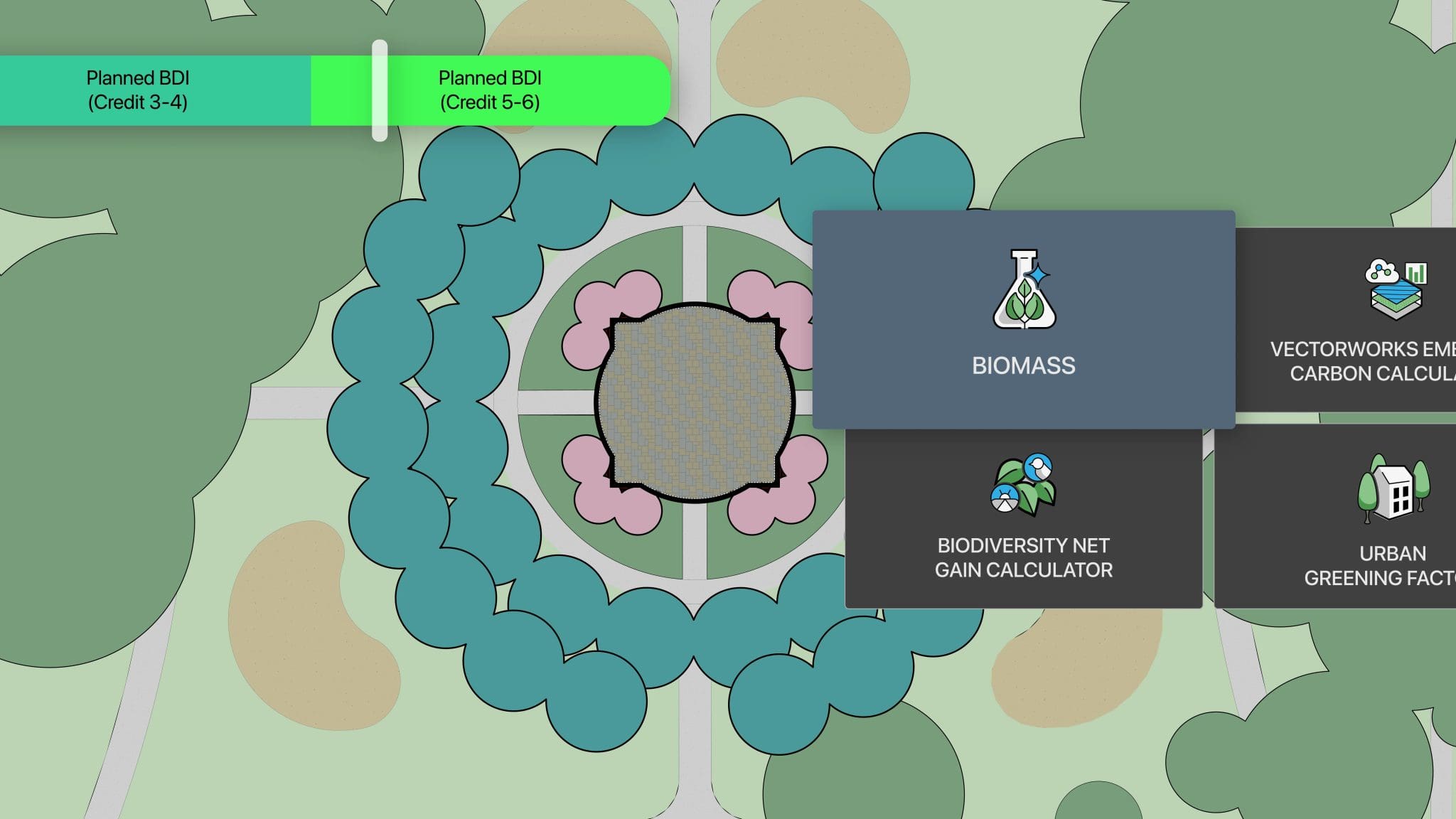 The Sustainability Dashboard is the central hub for sustainable design workflows in Vectorworks software. With the tracking tools in VECC, UGF, Biomass, and BNG working in unison, it provides the data clarity and control you need to design with purpose and precision.