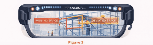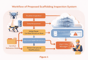 As shown in Figure 1, the workflow begins with an initial certified scan when the scaffolding is first erected. This digital model becomes the benchmark, or “reference twin,” against which all subsequent scans are compared. Periodic site scans – captured via drones, stationary sensors, or even robotic dogs – are uploaded to the cloud, where the AI automatically detects any deviations or missing elements.