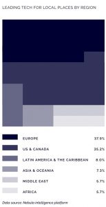The Levelling Up White Paper’s acknowledgement of the role of artificial intelligence (AI) as a driver of productivity in local contexts is reflected in our analysis of the PPT space: urban and local tech start-ups are most likely to say that they are using “AI/machine learning” as a key technology compared to start-ups focused on any other area. For example, StateUp 21 member UrbanFootprint (USA) uses machine learning to help urban planners and public officials make data-driven decisions, such as changing land usage policy or selecting sites for food distribution centres.