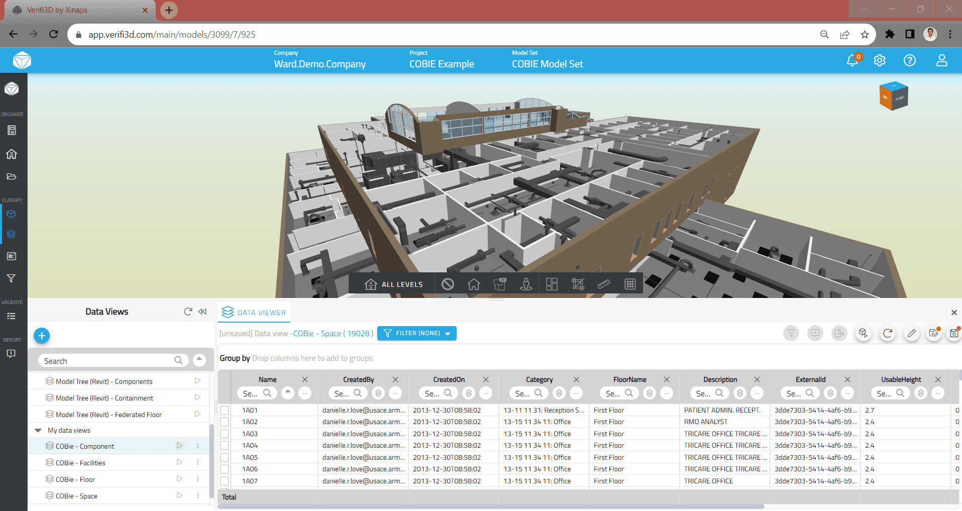This is useful for creating quantity take-offs, for example, and also ideal for creating COBie sheets. The Verifi3D team is working on expanding this capability to create further out-of-the-box COBie and IDS capabilities.