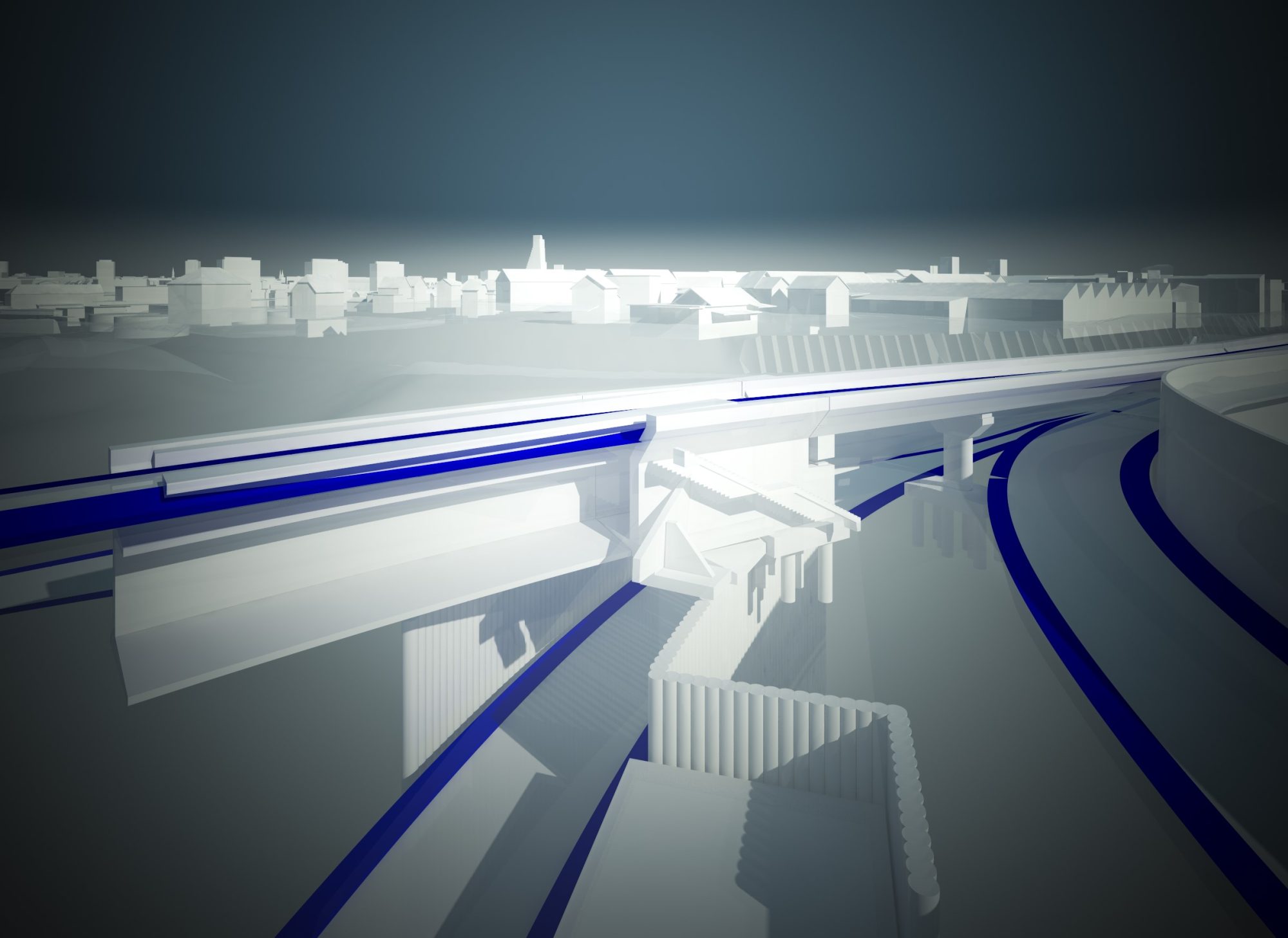 The new artificial structures and the currently existing road alignments lie on top of each other on up to four levels. In addition, the structures have many complex geometric shapes, which have irregular forms in all directions.