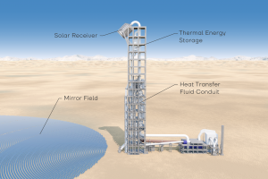 A field of mirrors concentrates solar radiation at a focal point at the top of a solar tower, where a solar receiver is located. When the sun shines, the concentrated sunlight heats a heat transfer fluid (HTF) inside the solar receiver to up to 1’500°C. Even when the sun isn’t shining, thermal energy storage ensures continuous cement production.