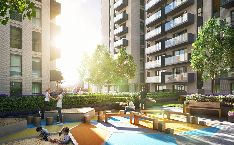 Properties have been designed to ensure that interiors are flooded with light, while externally the building will feature expanses of buff brick which perfectly resonates with the areas surrounding London stock buildings, and which is offset by re-constituted stone and cement finish cladding. A roof terrace, as well as two internal community amenity podiums, will feature, offering beautifully landscaped gardens and specially designed play areas for children.